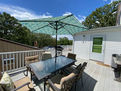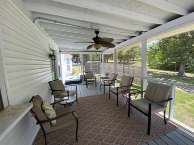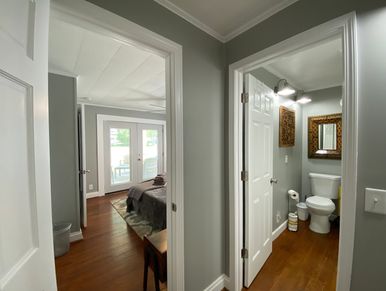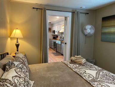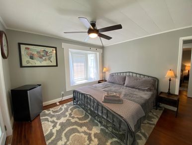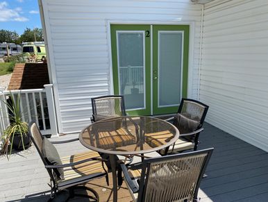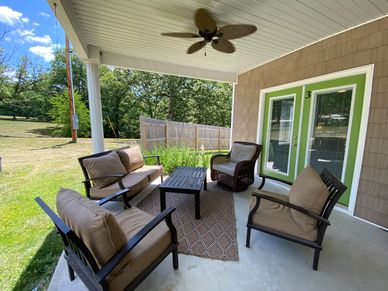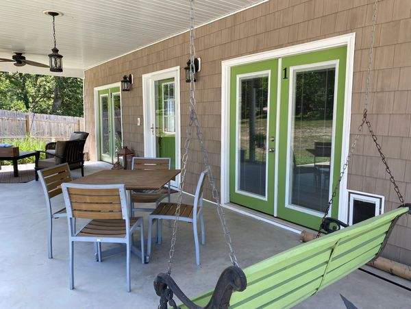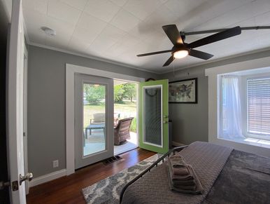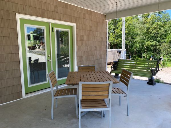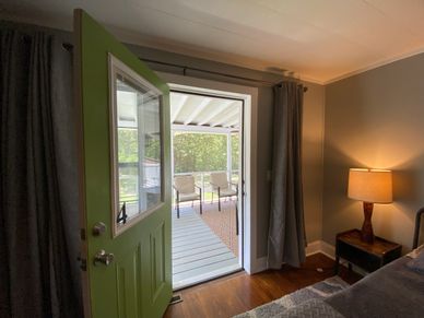 Bright and light. This room has a unique window alcove that allows lots of morning light in. Relax under the covered patio with large comfortable patio furniture. Store your food and beverages in the mini fridge. Room 3 has direct access to a bathroom that is shared with room 4.