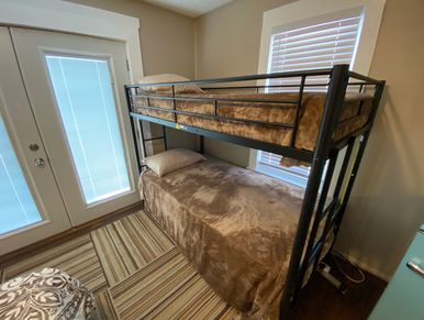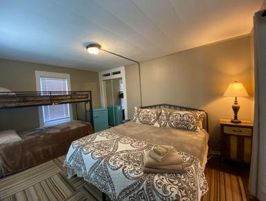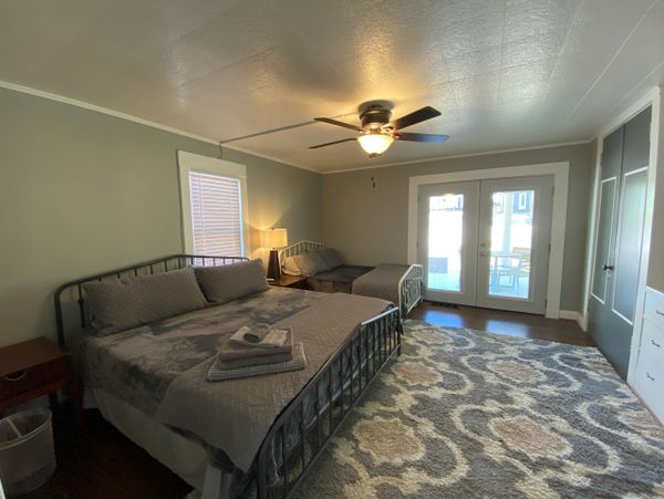 Perfect for a group of friends. This room comes with a King sized bed and Twin sized bunk beds. With its close proximity to the Pole Barn and pool, you’ll be right next to the action. This room comes with a mini fridge, wall mounted fan, and a patio with a table and 4 chairs.