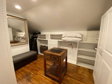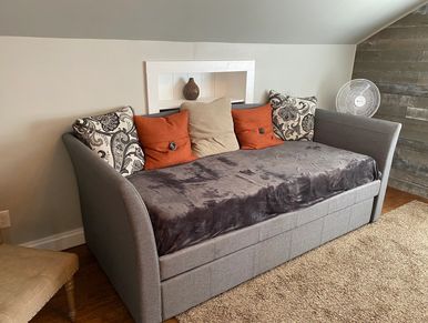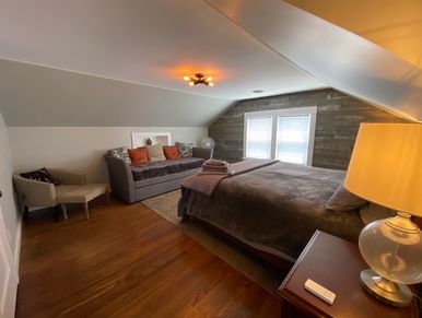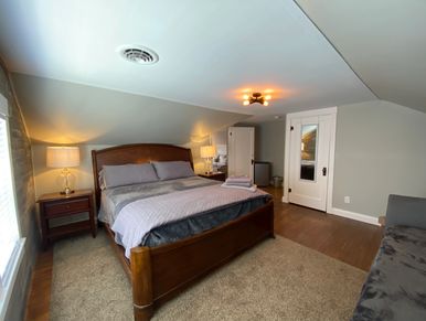 The ultimate luxury accommodation. This spacious room is located on the second floor and comes with a King sized bed and a daybed. A mini fridge is available for food and beverage storage. Enjoy a private bathroom with double sinks and a large glass shower. Look behind the curtain for the ultimate closet space.